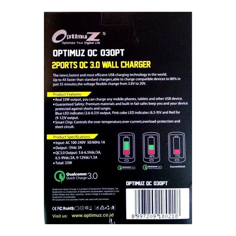 OptimuZ QC-030PT merupakan produk wall charger terbaru dari Optimuz dengan 2 Port (USB Quick Charge 3.0 & USB Type-C) yang memungkinkan mengisi daya sangat cepat secara bersamaan dengan output 33 watt. 4X lebih cepat dari charger standar, dapat mengisi daya devices yang kompatibel Quick Charge 3.0 hingga 80% hanya dalam waktu 35 menit.
