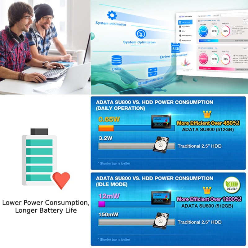 SU800 Ultimate mendukung teknologi DEVSLP (Device Sleep) untuk efisiensi energi yang lebih baik. Hal ini menyebabkan biaya listrik lebih rendah dan masa pakai baterai yang berkepanjangan. Dibandingkan dengan HDD tradisional, SU800 Ultimate hanya mengkonsumsi 8% daya saat dalam mode siaga, dan daya 80% lebih sedikit selama operasi reguler. Bagi pengguna yang sering bepergian atau melakukan perjalanan bisnis, SU800 Ultimate adalah mitra hebat dengan kemampuan mobilitas dan penghemat daya yang tinggi pada baterai notebook/laptop.