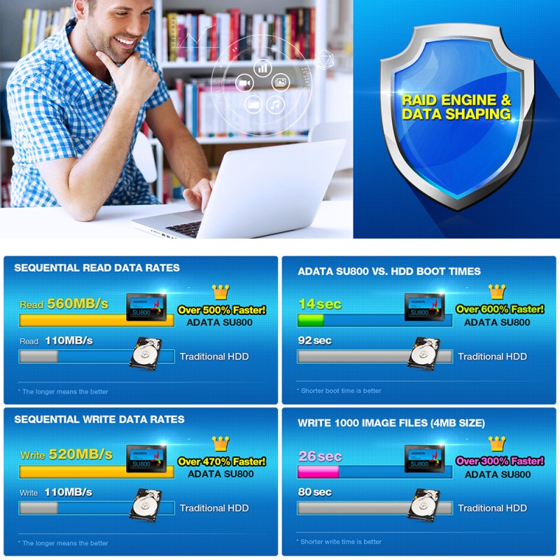 Dengan menggunakan material berkualitas tinggi dan teknologi canggih, SU800 Ultimate melebihi HDD tradisional dengan faktor yang sangat besar, dengan keunggulan khusus saat boot dan seek time, serta keseluruhan throughput baca / tulis yang jauh lebih cepat.